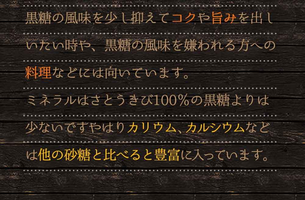 黒糖の風味を少し抑えてコクや旨みを出しいたい時や、黒糖の風味を嫌われる方への料理などには向いています。